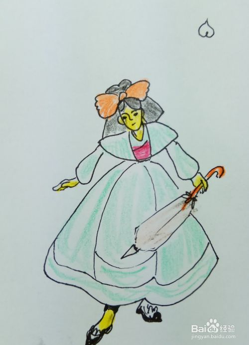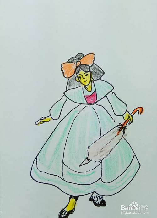 再用水彩笔涂出小姑娘的皮肤色彩,然后涂出她身上穿着的衣服色彩,头发色彩和头上的饰品色彩,再涂出她的腿部和脚上的鞋子色彩。修饰一下细节,简笔画就画好了。