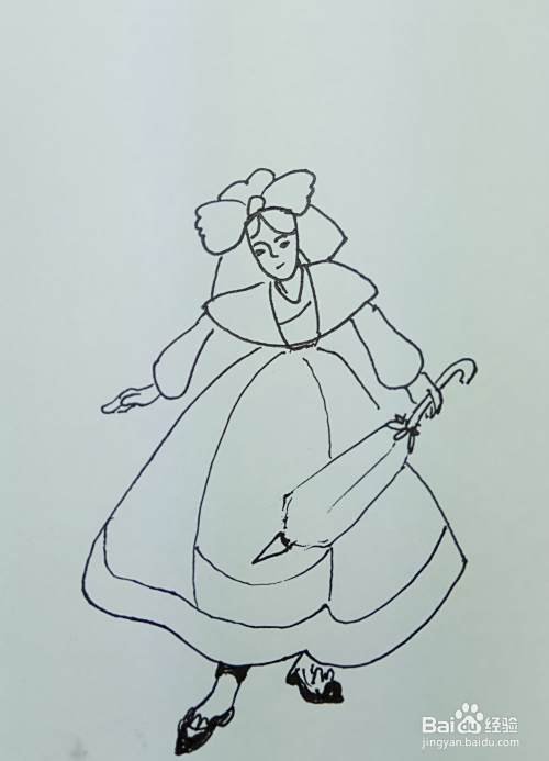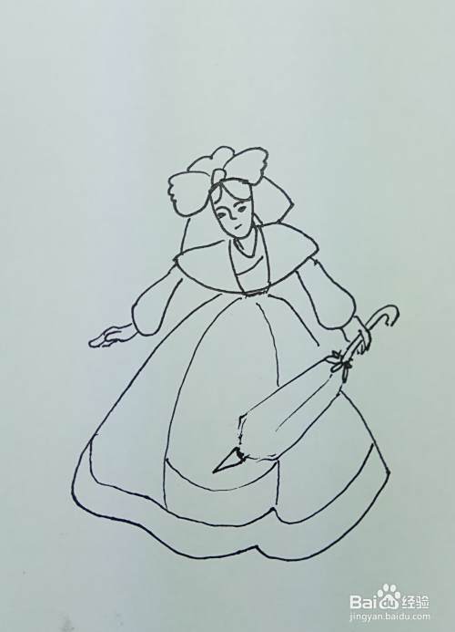 再用线条和弧线画出小姑娘身上穿着的漂亮裙子,小姑娘的裙裙摆特别大。