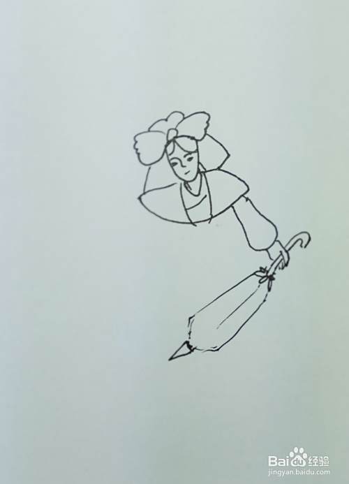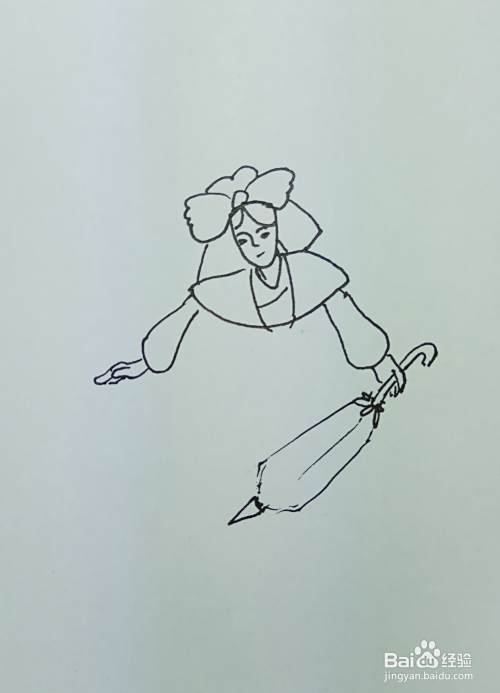 然后用线条和曲线画出小姑娘左边的胳膊和她手里拿着的一把雨伞的外形轮廓,这把雨伞没有打开。