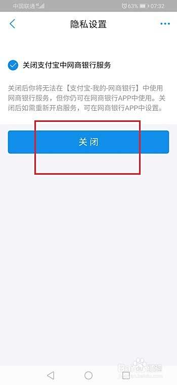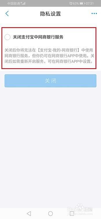 第四步在隐私设置中,可以看到关闭支付宝中网商银行服务,如下图所示:
