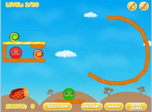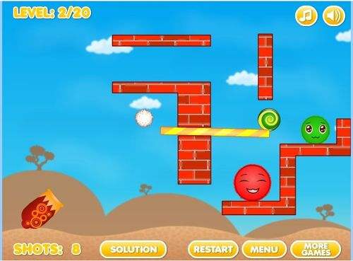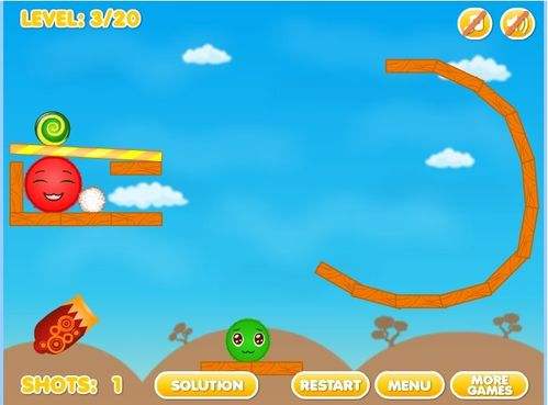 3第三关将大炮对准弯曲的木板最上头,射出小球,小球会通过滑下来的力度飞跃到对面撞击小红球,这时小红球与大红球相结合,而上面的小绿球通过刚才撞击到的力度,使之凸起,掉下来与大绿球结合成更大的绿球