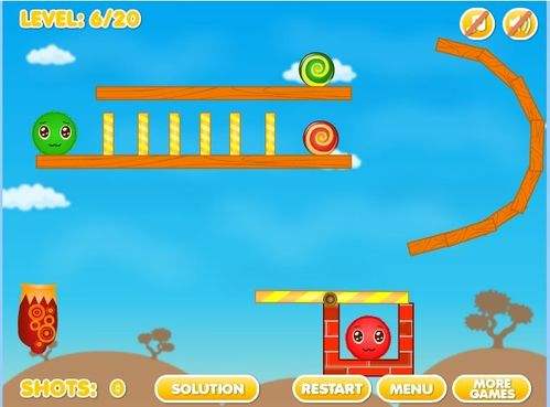 6第六关射击出小球到弯曲的第四块木板上,小球会顺着路冲到最上面撞击小绿球,小绿球往左移动与大绿球融洽,之后把下面的木板用小球撞开,再打上面的大绿球,大绿球一路撞开挡住的木板,将小红球弄进下面的大红球里。