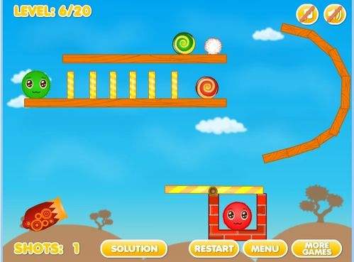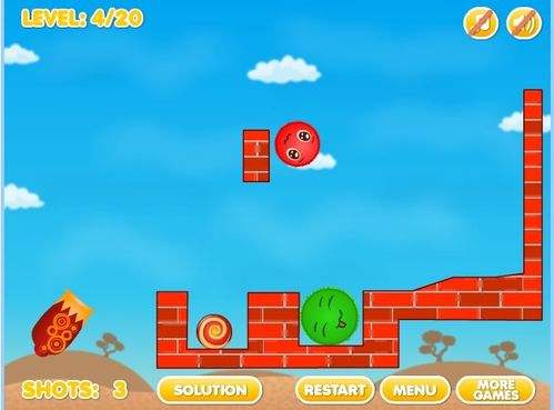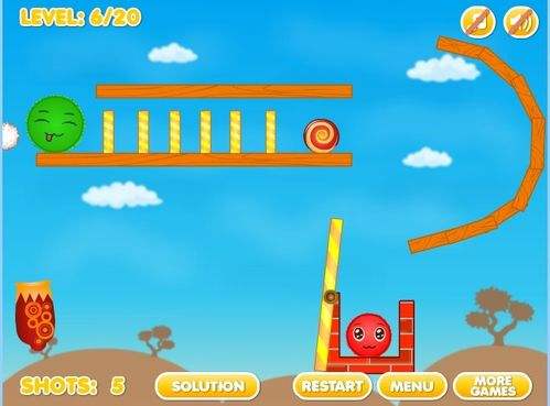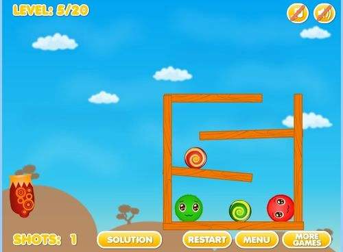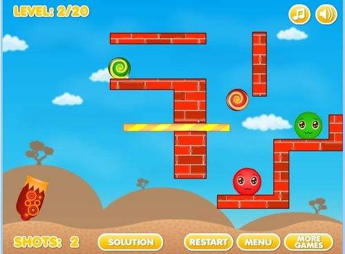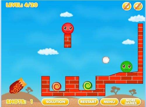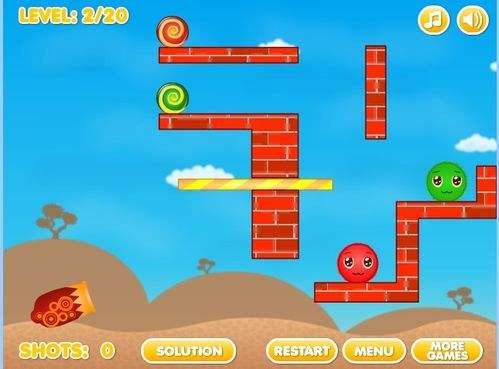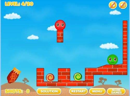 4第四关将大炮瞄准悬挂在空中的红砖底部,通过红砖底部发射出小球,撞击到对面的墙上,大绿球便会顺下与小绿球融洽,最后掌握好这次发射的力度,轻轻用大炮射中上面大红球的底部,大红球就会顺之往下落,这时有绿球挡着,大红球就能很顺利向左旁移动,与小红球相融洽。