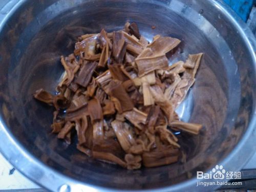 把笋干放在小碗里面,然后倒入开水,要没过笋干,浸泡其变软。