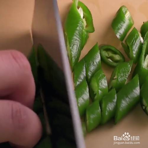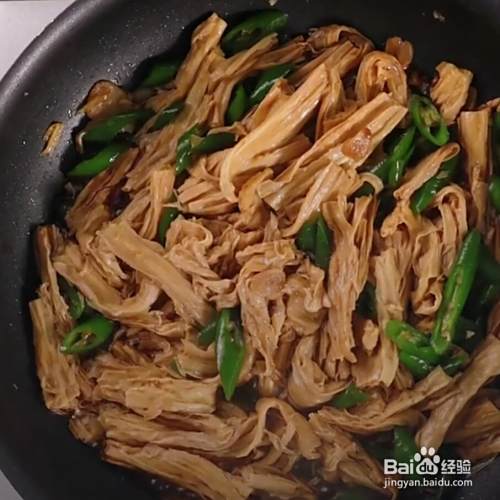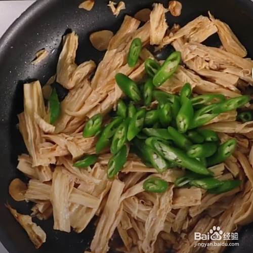 倒入辣椒段,翻炒。