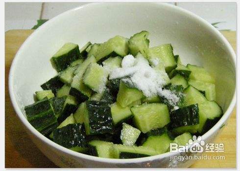 将黄瓜洗净,切去两头,再切成小块,放大碗内加盐拌匀,腌15分钟这样,轻轻挤去水分。