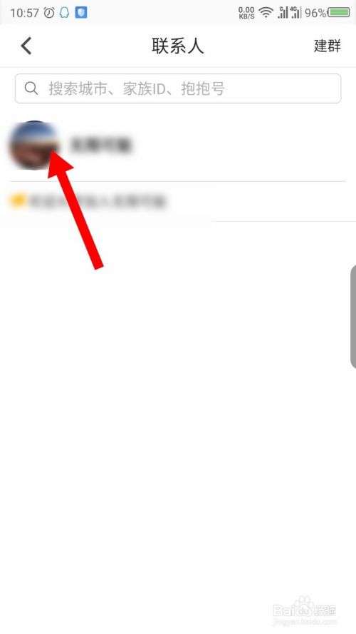 在打开的联系人界面,选择要退出的家族,点击进入。如图