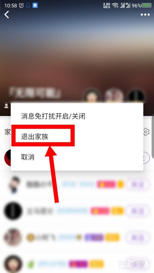 在屏幕中间会弹出一个选项窗口,点击退出家族。如图