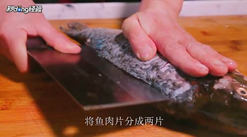 1将鱼肉片分成两片,斜刀片鱼片,鱼片中放入蛋清,加盐、料酒、淀粉抓匀后腌制。