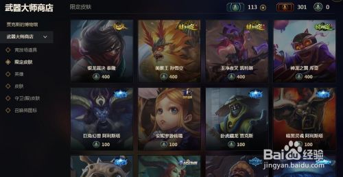 我们选择进入武器大师的商店,然后选择限定皮肤,在这里我们可以使用星魄水晶来选取一些限定的皮肤。只是难度会高一些。