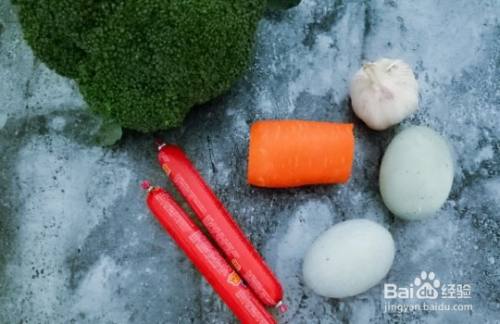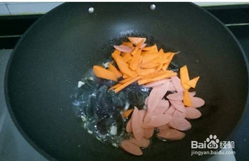 倒入胡萝卜,皮蛋,火腿肠炒;