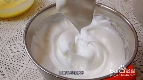 蛋清冷冻四五分钟,一边搅拌一边放糖,蛋清打至细腻状态。