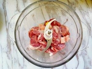 接着将猪肉洗净切成片,然后放入绞肉机里,再加入姜片,一起打成肉泥,