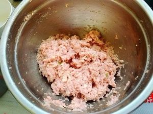 再加入1大勺红薯淀粉和少许清水,用筷子顺着一个方向搅打,肉泥上劲即可。