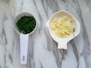 首先将香葱去根洗净切碎,葱白和葱叶分开摆放,生姜去皮洗净切片,大蒜拍扁去皮后剁碎。