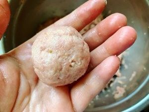 水开后,手上抹点水,取适量肉泥揉成圆形的大丸子,将揉好的丸子放在抹了油的蒸架上,摆放整齐。