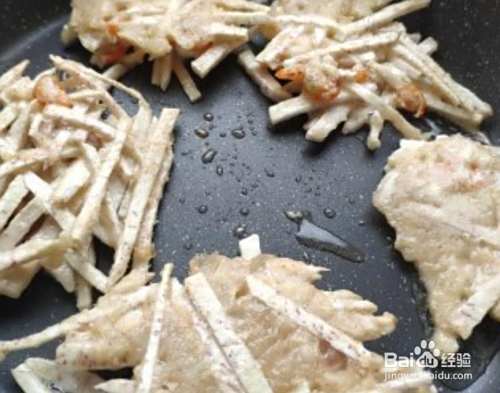 现在开始煎了,平底锅加热放油,可以多放点,用勺子弄一些搅拌好的芋头丝到平底锅里慢慢煎,两面煎到金黄色即可。