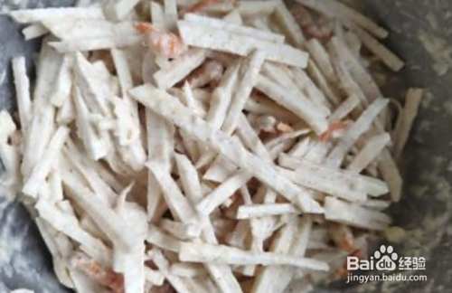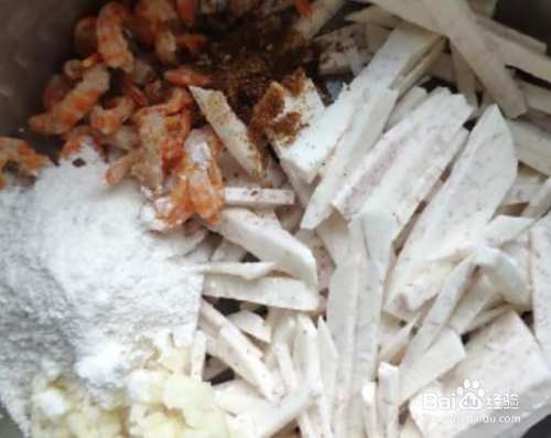 把芋头去皮切成小条状,虾仁用水泡20多分钟左右,蒜头切碎,准备一个大碗,把芋头丝,虾仁,面粉,蒜头碎,放进去,加一些佐料精,盐,再加一些水,搅拌均匀。