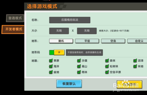 点击更多好玩地图左边的创建新世界,点击普通模式下面的开发者模式