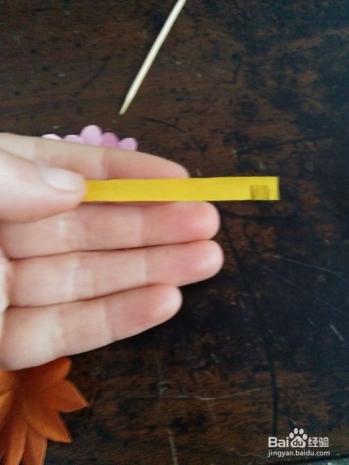 我们再取一个黄颜色的长条纸,然后用牙签把它卷成卷,尾部用胶水粘住。