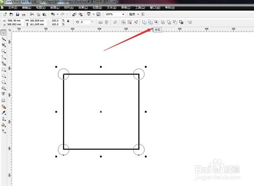 将四个圆形进行群组,然后加选矩形,在属性栏中找到修剪图标,进行修剪,将多余的部分删除掉