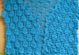 引拔三针,再三针辫子,在每个渔网里钩四个长针,袖子内弧度这边钩袖山,外弧度那边钩花边,(如果两条花的两边都要钩长针的时候,钩完一边长针后,用引拔针,引到另一边,继续在渔网里钩长针。