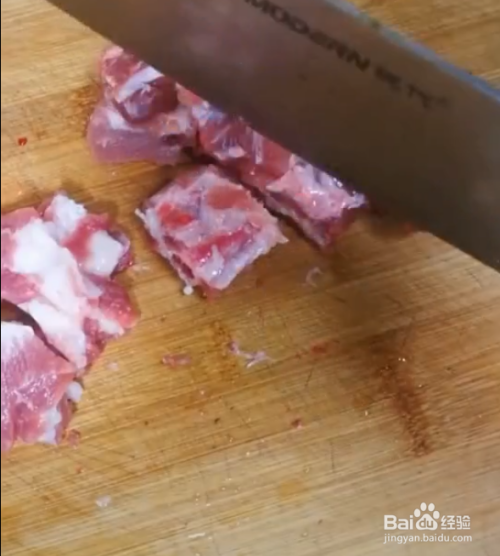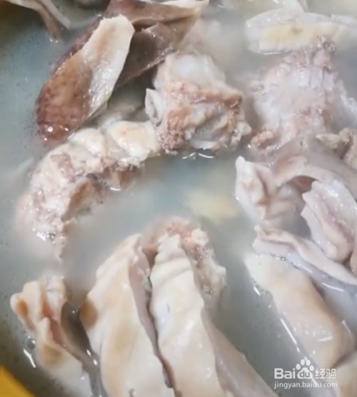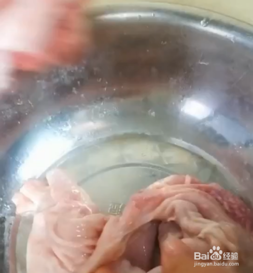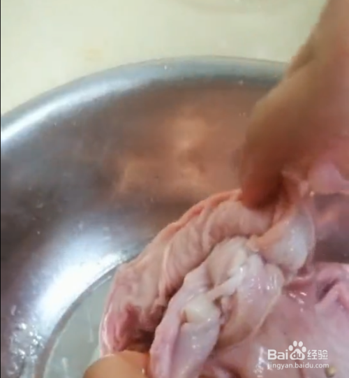 猪肚用盐、生粉反复揉搓,用水清洗干净。