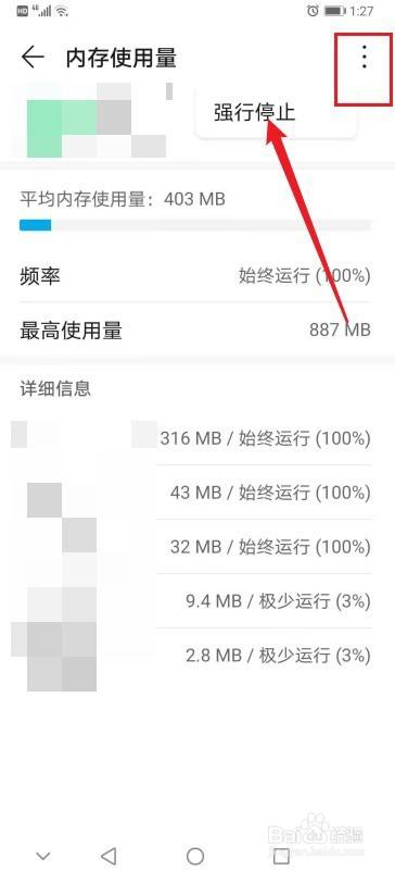 对于异常应用,点中后可选择“强行停止”释放内存。
