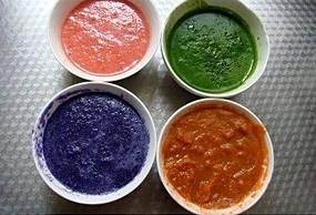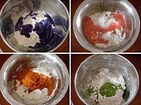 2.把800克面粉分成4份各200克,分别加入80克不同的菜泥汁。