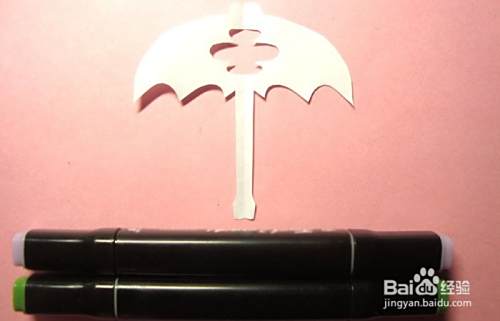 然后,把漂亮的儿童雨伞图形的剪纸,展平,摆放在桌子上,并选择绿色、浅红色的马克笔,准备涂上颜色,如下图所示。