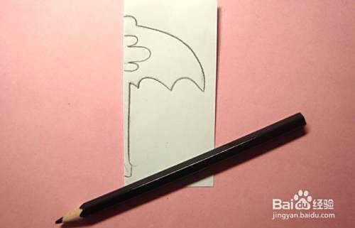 接着,把正方形卡纸对折一半,并用铅笔在白纸上,画出漂亮的儿童雨伞的图形,根据对称图形,这里画出半个图形,如下图所示。
