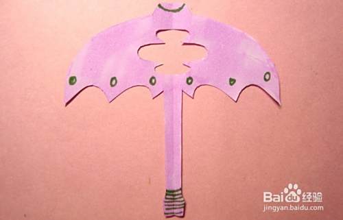 最后,用浅红色的马克笔,在剪出的漂亮的儿童雨伞图形上,涂颜色,注意颜色要涂均匀,并用绿色的马克笔在漂亮的儿童雨伞图形上画出装饰图形,这样一个漂亮的儿童雨伞剪纸手工就制作好了,如下图所示。