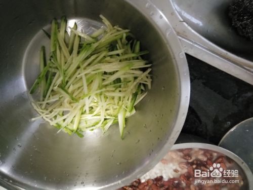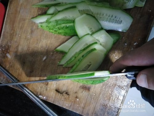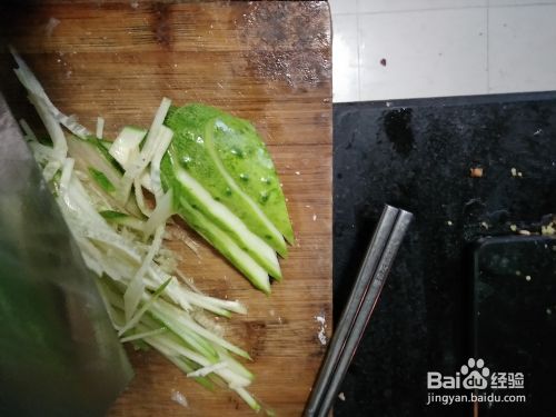 再将切成片的黄瓜片,堆叠在一起,切成丝