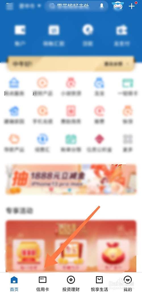 首先在中国建设银行首页找到信用卡,点击进入.