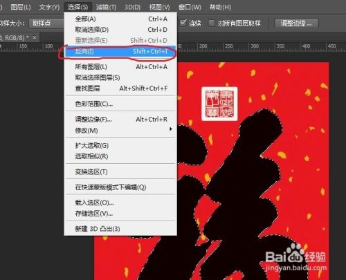 点击“选择”-“反向”,将选区选择的区域转换为黑色部分以外的部分。