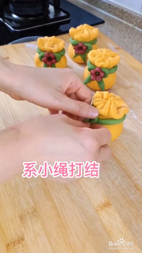 再来点面糊搓成条,系小绳打结,做出一个小花装饰。