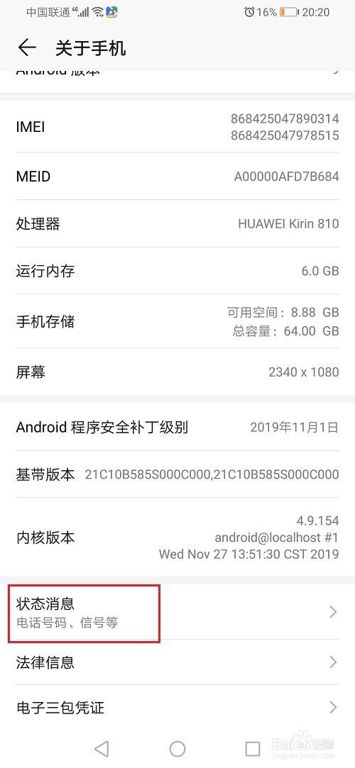 第四步进去华为荣耀手机关于手机界面,选择状态信息
