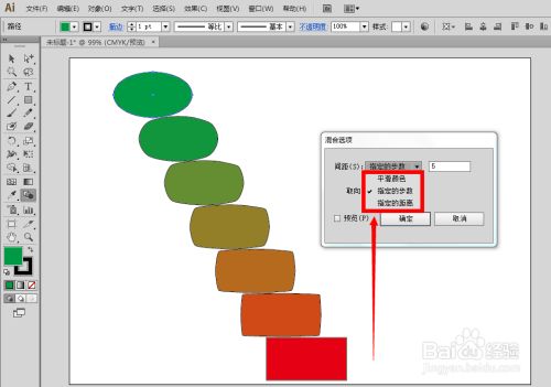 用鼠标点开间距一栏右边的下拉三角形,可以看到里面总共有三个选项,”平滑颜色“、”指定的步数“、”指定的距离“,三个设置分别有什么不同?