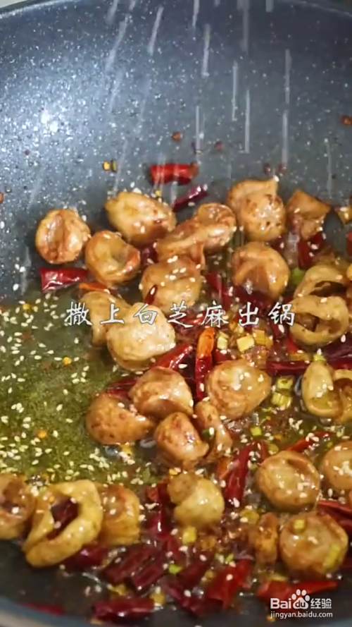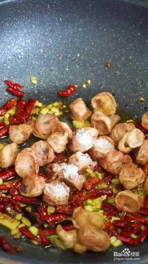 锅留底油,放入葱姜干辣椒花椒炒出香味,倒入炸好的肥肠