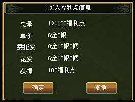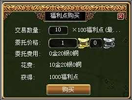 4、点击【金币购买福利点】按键,将弹出以下界面,如下图所示:系统会自动形成最便宜的福利点数购买,在没有玩家出售福利点的情况下,系统会以当前服务器的默认价格询问玩家是否进行挂单购买,在玩家同意的情况下,则会形成挂单,形成的挂单可在查询界面中查看。