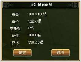3、点击【钻石购买金币】按键,将弹出以下界面,如下图所示:当玩家以100钻为单位进行购买金币,系统会自动形成最便宜的金币购买,在没有玩家出售金币的情况下,系统会以当前服务器的默认价格询问玩家是否进行挂单购买,在玩家同意的情况下,则会形成挂单,形成的挂单可在查询界面中查看。