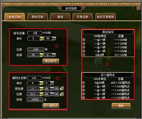 点击【挂单买卖】栏,将会看到以下界面,如下图所示:在【挂单买卖】栏中,在①号框内,玩家以100钻为单位输入需要卖出的钻石数量和该单位的金币在②号框内,玩家以福利点数100点为单位输入需购买的福利点数数量和该单位的金币单价,买入福利点数需花费一定委托费用,同时系统会自动结算出此笔挂单的福利点和金币总数,最后点击买入福利点,系统将弹出此笔挂单的信息界面,确认后即可形成挂单,界面如下:在③号框内,分别显示的是【卖出钻石】以100钻为单位,金价最便宜的前5项和【买入福利点】以100点为单位,金价最高的前5项