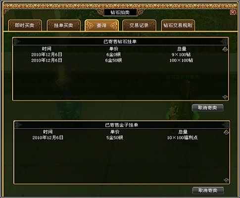 5、 点击【查询】栏,玩家可以看到自己所拍卖的钻石和金币的挂单以及取消寄卖功能,具体如