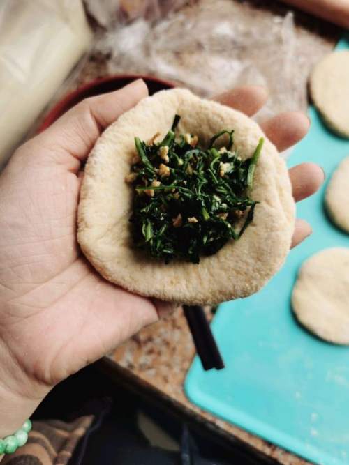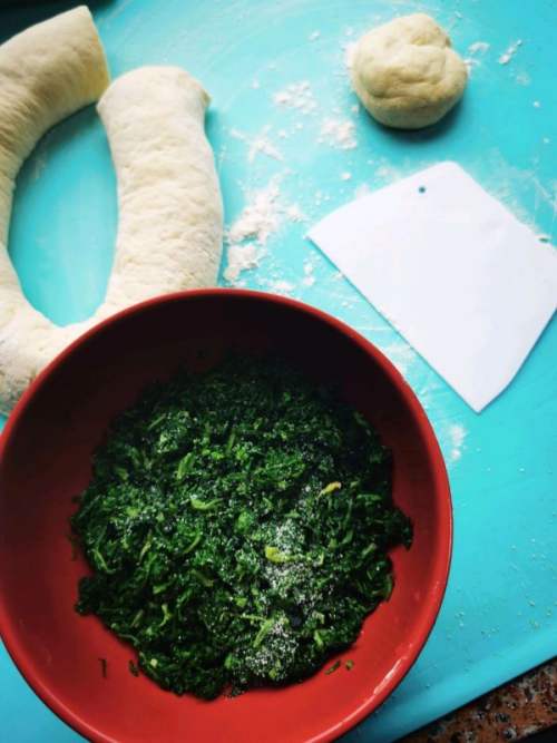 2早晨,面从冰箱拿出,排气揉面。然后像包包子一样 将面团中间抠孔,揉成面棍并切成12份。荠荠菜反复清洗,用几滴白醋泡洗。然后滚水焯不超过十秒钟。挤出水分揉成团可以冷冻。留做菜的切碎。