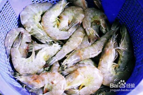 将虾洗净剪去虾须,去虾枪。用牙签从背部挑去虾线,用剪刀在虾背部从头剪到尾。虾放入碗中倒入料酒腌制会。
