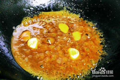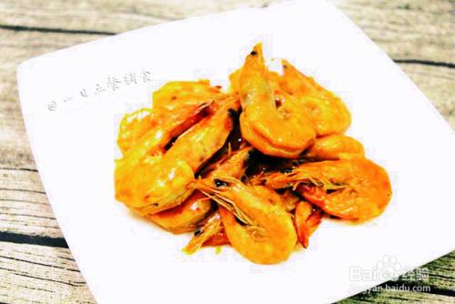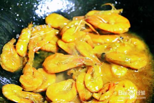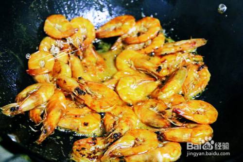 热锅热油。放大虾两面煎成漂亮的红色出虾油后,盛出虾(用锅铲轻轻压一压虾,红油出的多)。