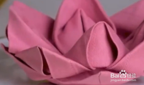 然后将折好三次的餐巾翻过去另一面,四角向中间折叠;