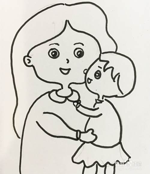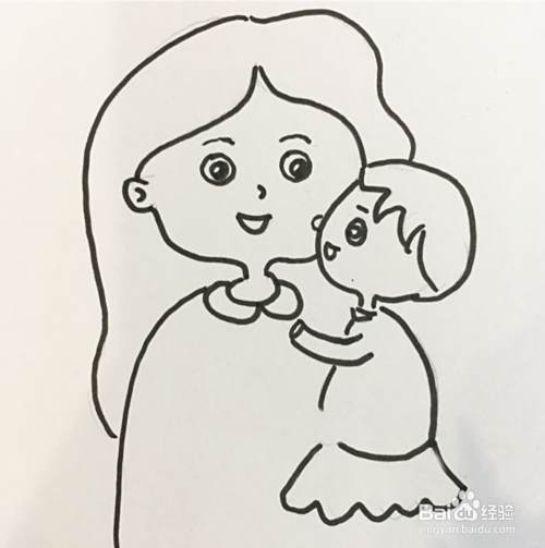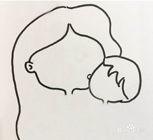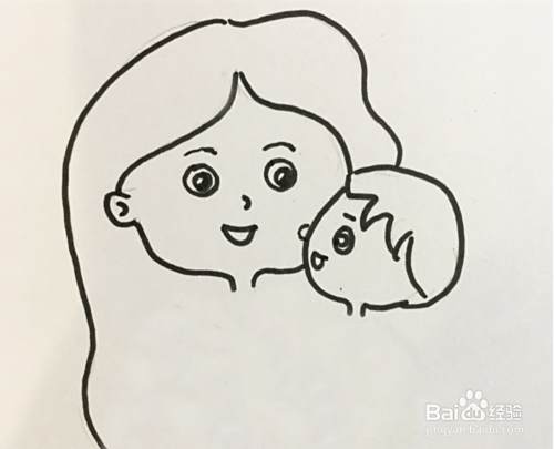 画出孩子小小的侧面头部轮廓,再在旁边将妈妈的头发线条与脸部轮廓画出来,还要画出两人的耳朵