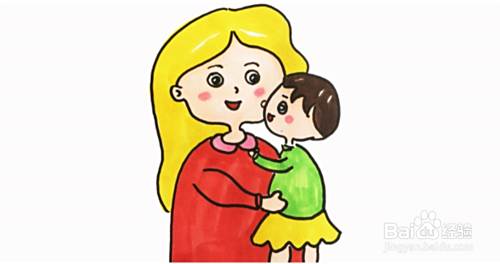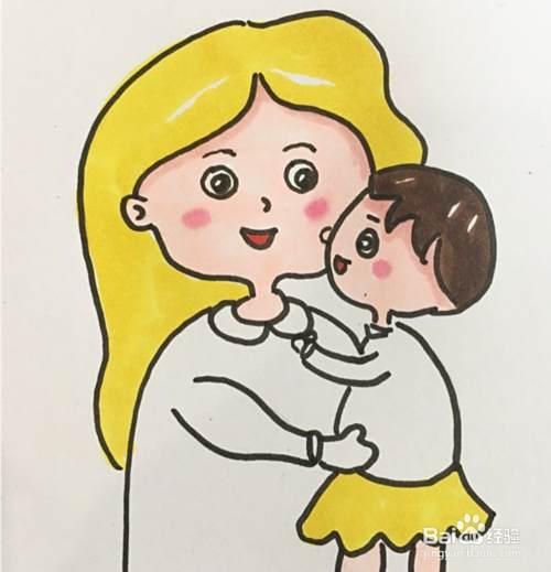 给妈妈脸上画出微笑着的表情后,给小孩子画上侧面的眉毛、眼睛、嘴巴和鼻子