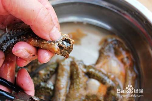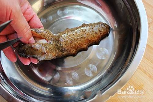 把鲜活的鲜海参买回家以后,一定要及时破腹取脏,否则海参会很快消瘦,甚至还会自溶为液体。方法很简单,就是剖开鲜海参的肚子,把肚子里面的肠胃等东西摘净,然后用洗水洗净,再摘除参嘴。